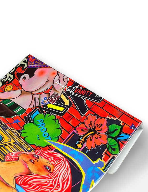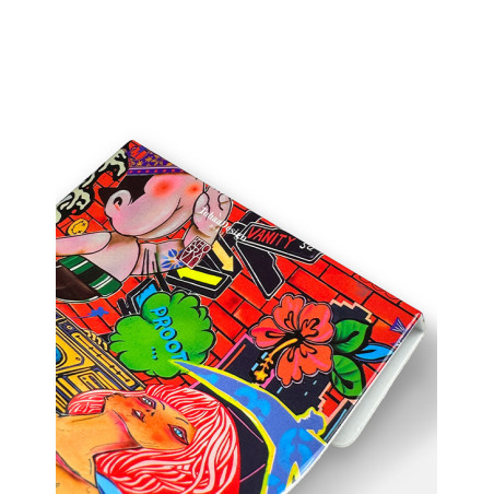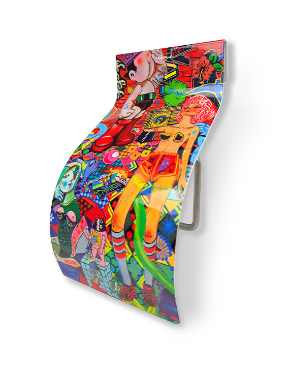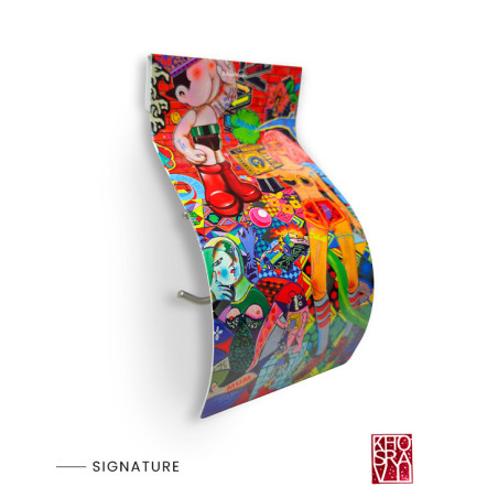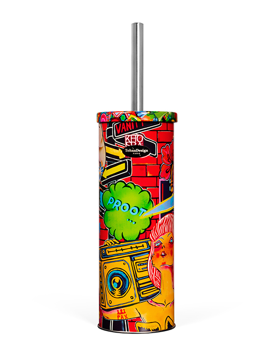 This original, colorful toilet paper holder model transports us into the pop and dynamic world of the talented Guive Khosravi. "Vanity Fair," which he created for TohaaDesign, immerses us in an explosion of vibrant tones and original graphics.