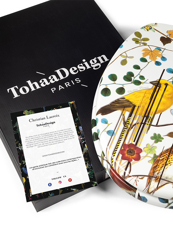 La tavoletta "BirdyFlowers", che si contraddistingue per i suoi motivi colorati e una grande originalità, è nata da una collaborazione unica tra TohaaDesign e l’artista Bishop Parigo. Un design ardito, unico al mondo, perfetto per trasformare il tuo bagno in un luogo originale. Questa creazione conquisterà gli appassionati d’arte.